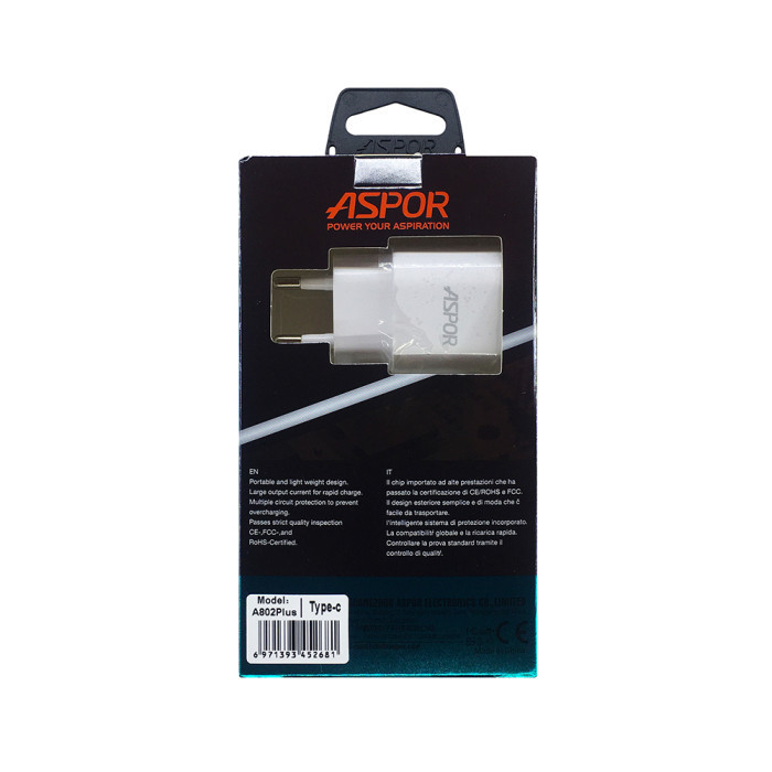 Представляємо вам зарядний пристрій Aspor, модель A802 Plus, комплектується USB кабелем Type-C у білому кольорі, призначений для зарядки електронних гаджетів з низькою потужністю. Цей зарядний пристрій ідеально підходить для підзарядки таких пристроїв, як смартфони, смарт-годинники, смарт-будильники, колонки, навушники, портативні акумулятори та інша техніка, яка працює від акумулятора. Корпус пристрою має округлу форму з вбудованим кабелем Type-C та портом USB на торці. Це дозволяє одночасно заряджати два пристрої, а світловий індикатор LED повідомляє про завершення процесу зарядки. Присутній гравірувальний брендовий логотип і європейський тип вилки, а також вбудований захист від перегріву та перепадів напруги. Цей універсальний пристрій є зручним, компактним та надійним, і стане відмінним доповненням для ваших електронних пристроїв. Наш консультант завжди готовий допомогти вам у виборі додаткового кабелю для другого пристрою.Характеристики