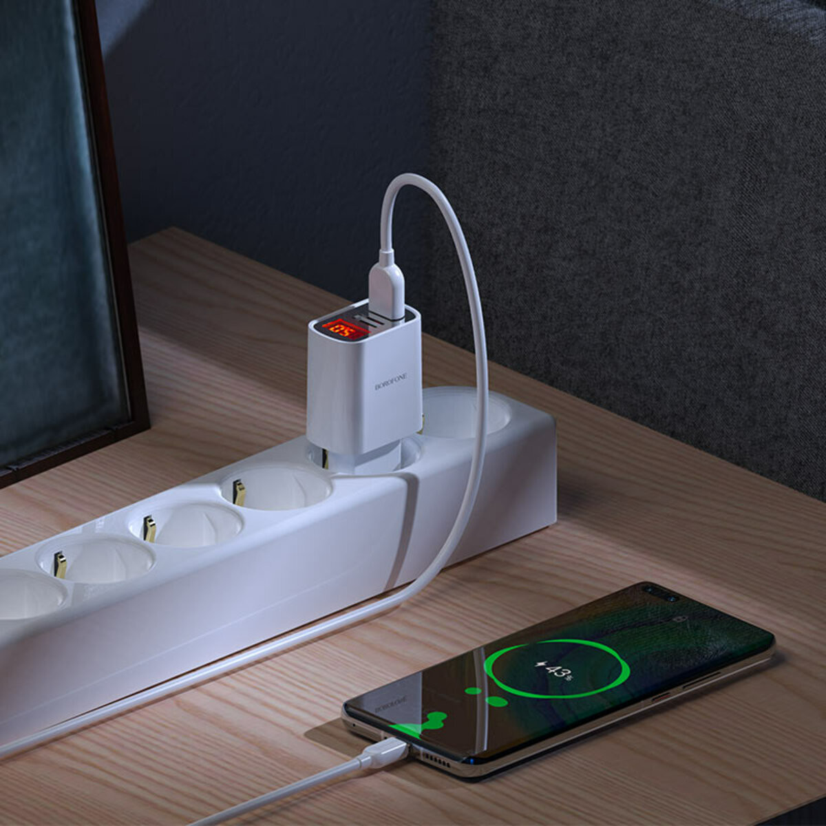 BA58A Mighty — мережевий зарядний пристрій від провідного світового виробника цифрових аксесуарів BOROFONE. МЗП оснащений двома USB-портами 5 V / 2.4 A і штекером європейського стандарту. Постачається у комплекті з однометровим кабелем для роз’єму Type-C. Особливість моделі BA58A Mighty — цифровий LED-дисплей. У режимі реального часу на ньому відображається вихідна напруга й ток. Зарядний пристрій BA58A Mighty від BOROFONE — безпечний і надійний аксесуар. По-перше, він оснащений системою захисту від короткого замикання, а також перепадів напруги. По-друге, він виготовлений із вогнестійкого матеріалу полікарбонату. Модель BA58A Mighty має естетичний дизайн білого кольору. Завдяки невеликим розмірам пристрій легко поміщається в маленькій кишені або сумці. Разом із тим його корпус відрізняється хорошою стійкістю до подряпин, відколів та інших механічних пошкоджень.Характеристики
